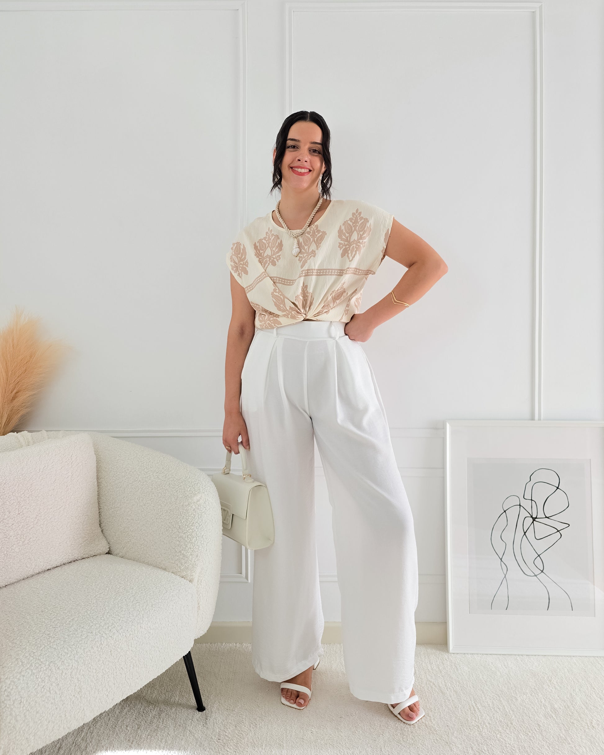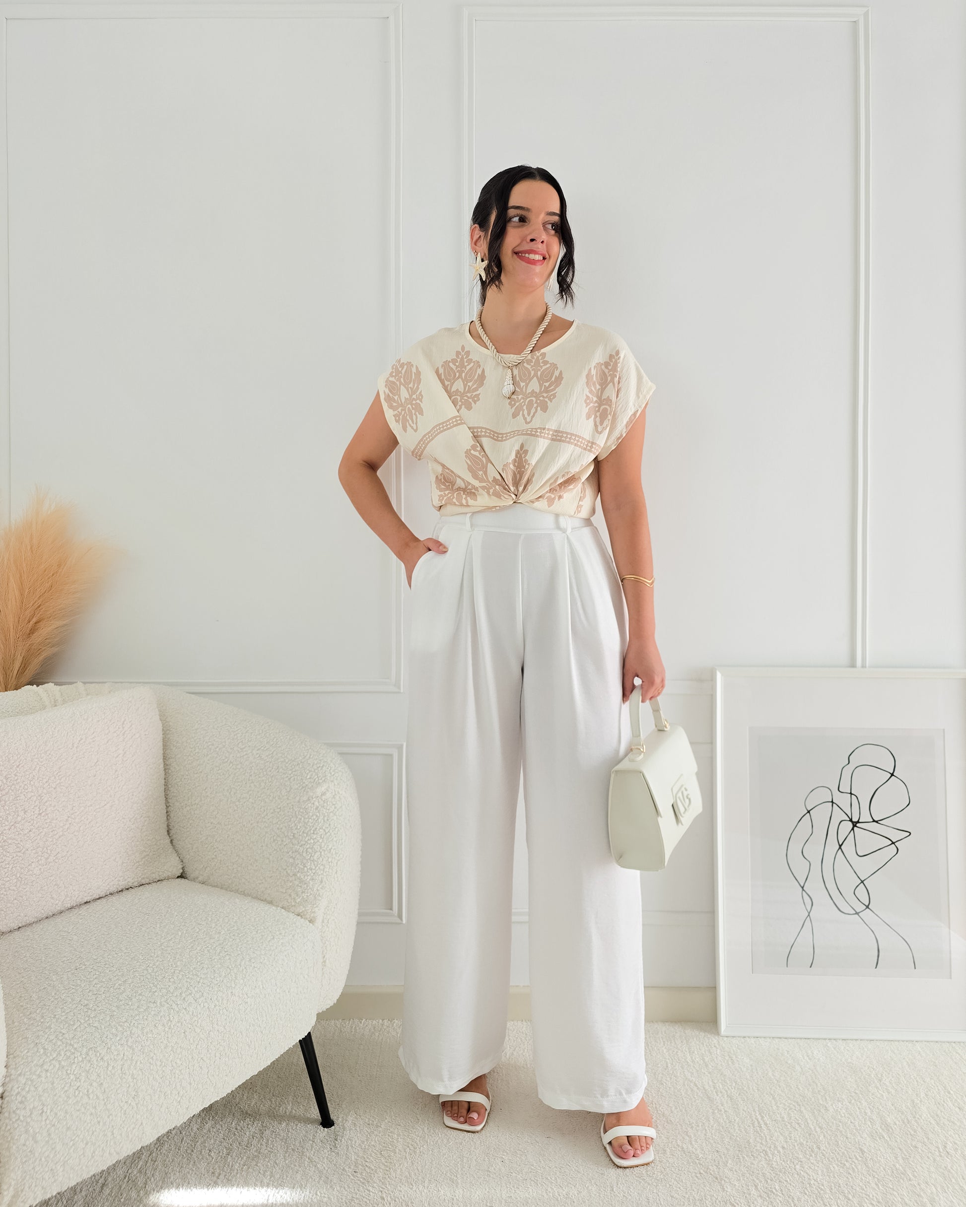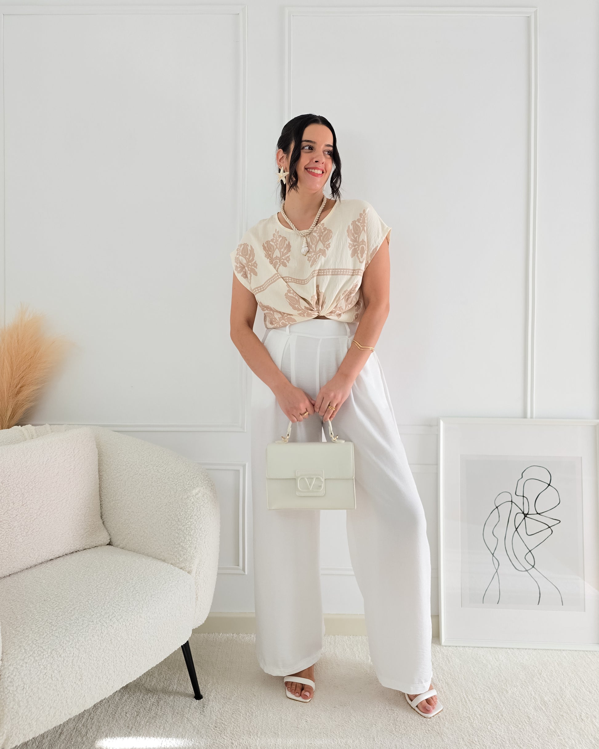 Dicas de Estilo: Combina com calças largas ou uma saia para um look casual e elegante. Adiciona acessórios simples para um visual leve e fresco.