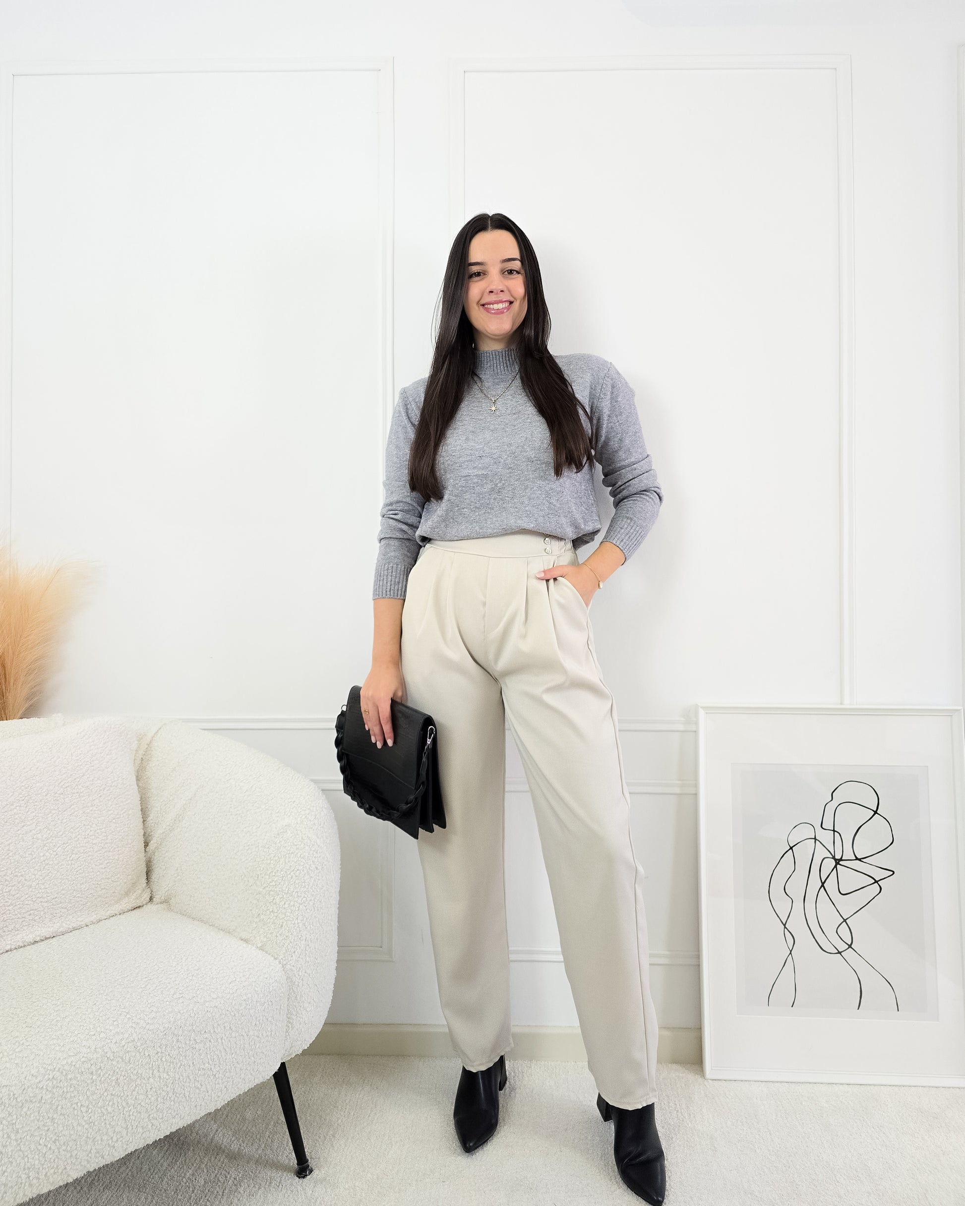 - Corte de Alfaiataria: Silhueta clássica e sofisticada, com cintura subida que valoriza a figura e alonga as pernas.