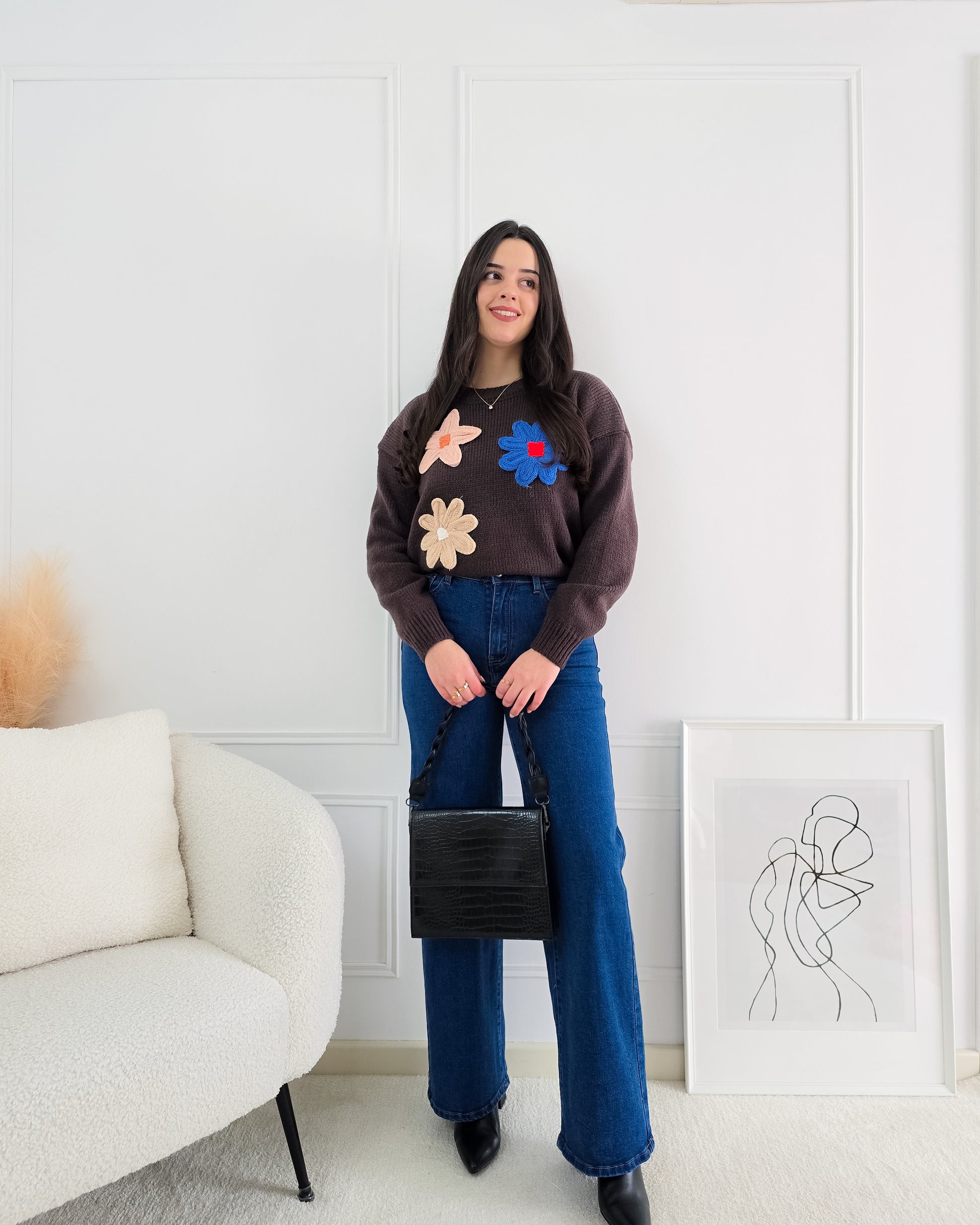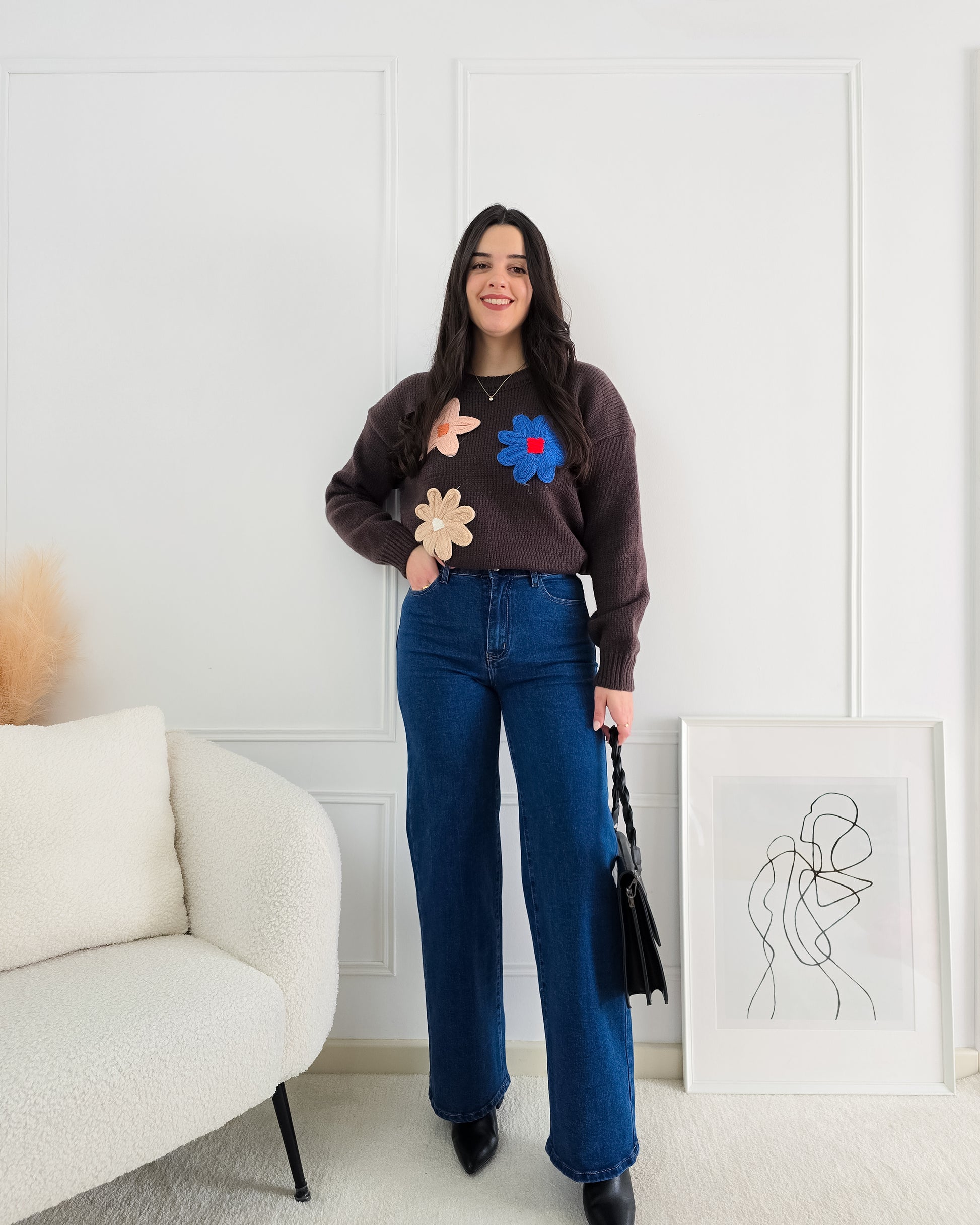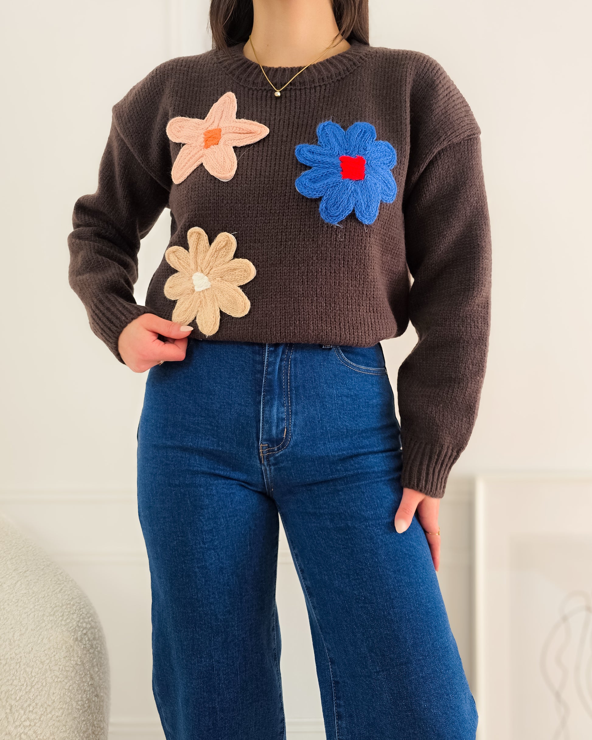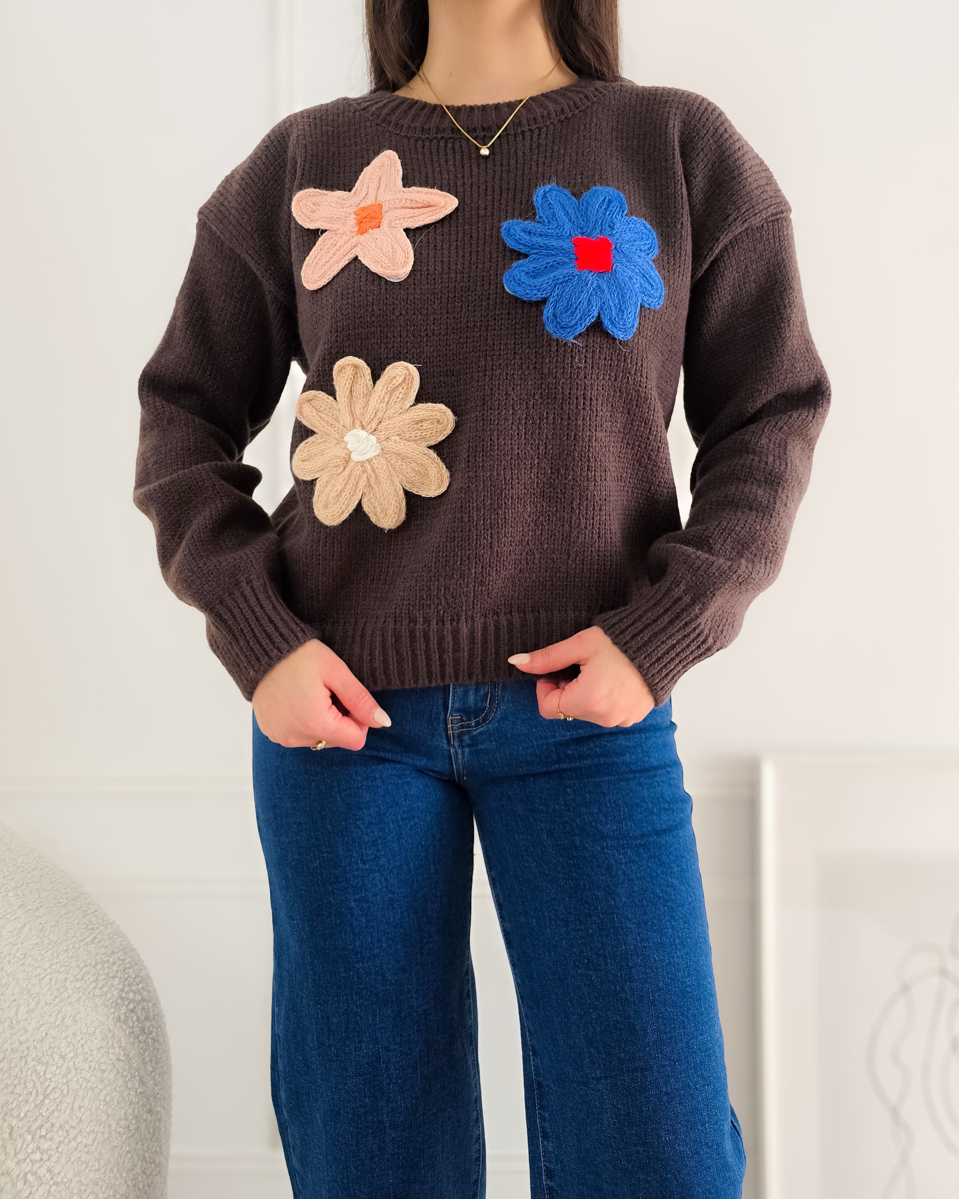 Dá um toque divertido e cheio de cor aos teus looks com esta camisola de malha decorada com flores em relevo – perfeita para alegrar qualquer dia!