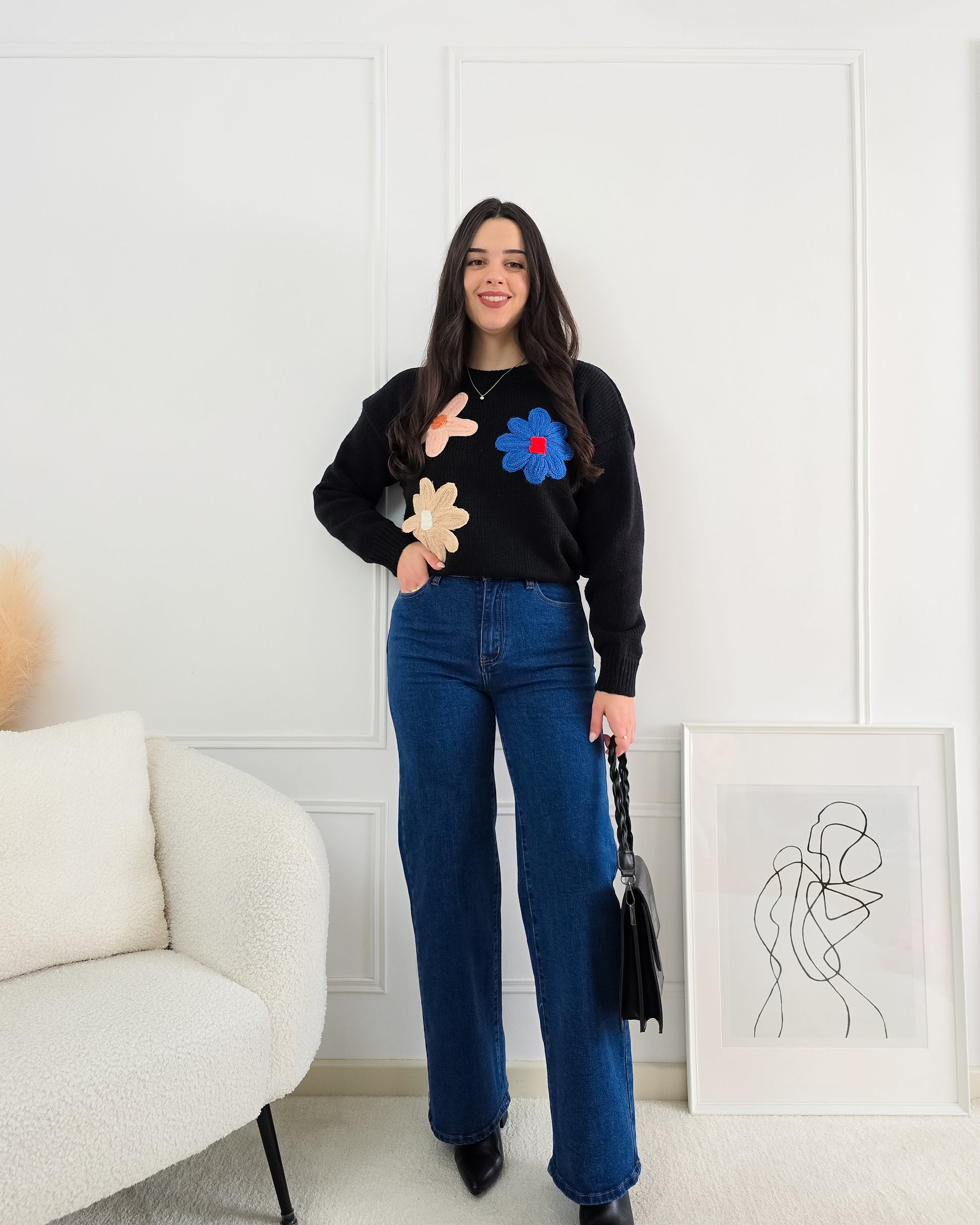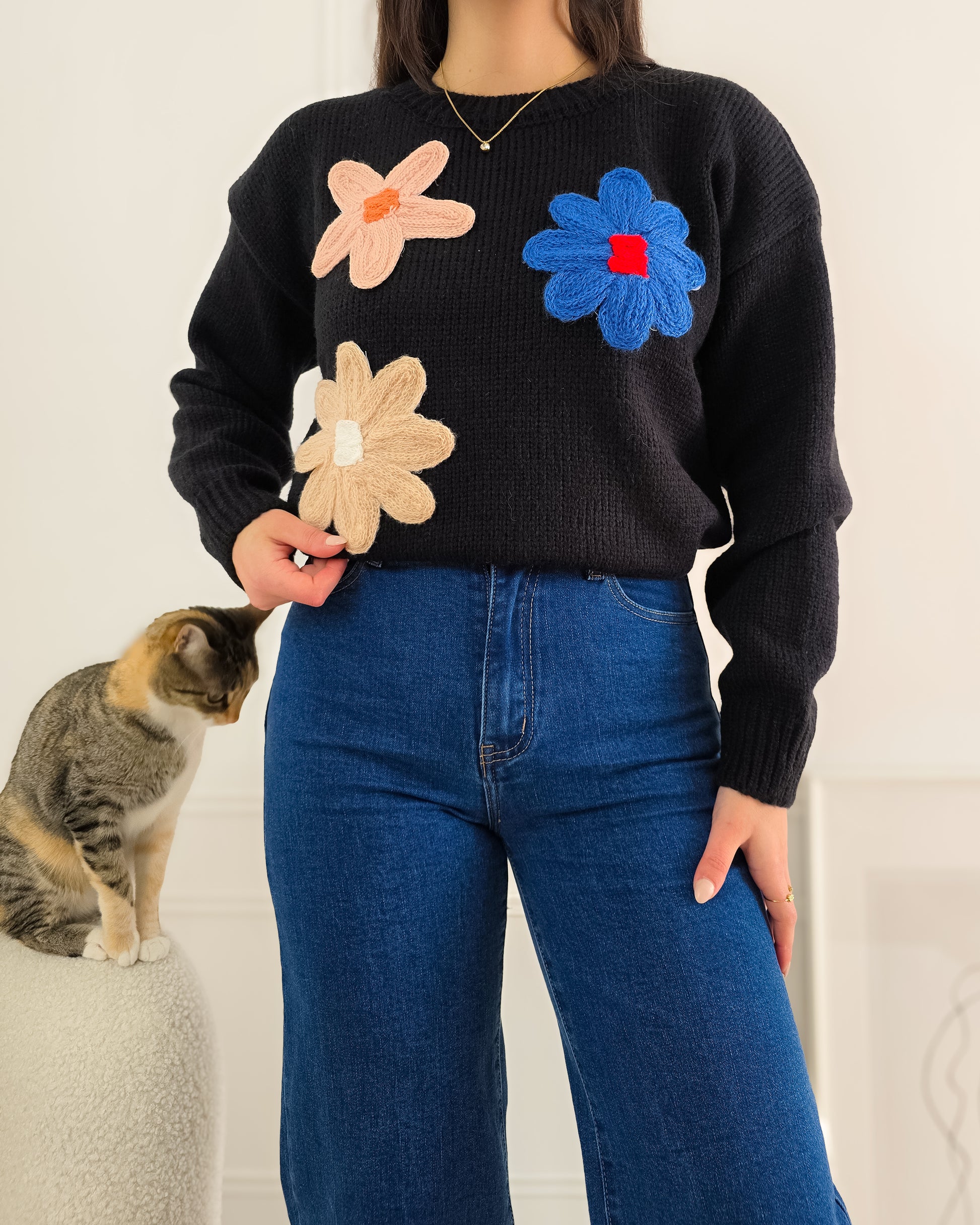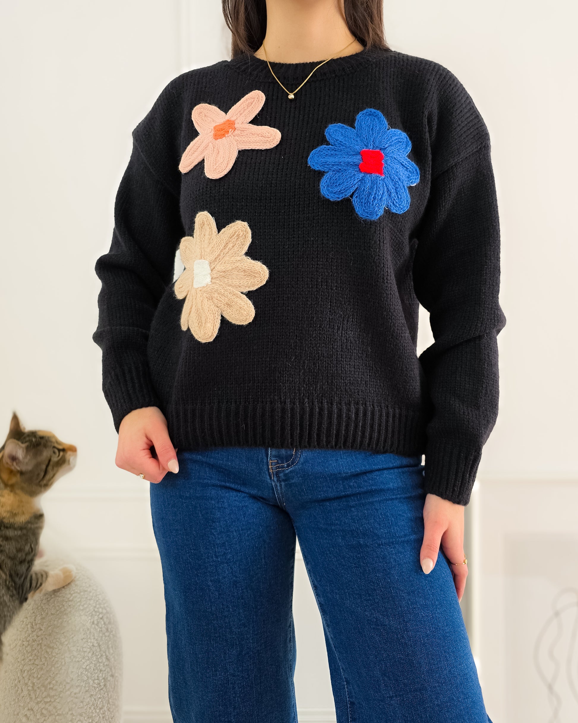 Dá um toque divertido e cheio de cor aos teus looks com esta camisola de malha decorada com flores em relevo – perfeita para alegrar qualquer dia!
