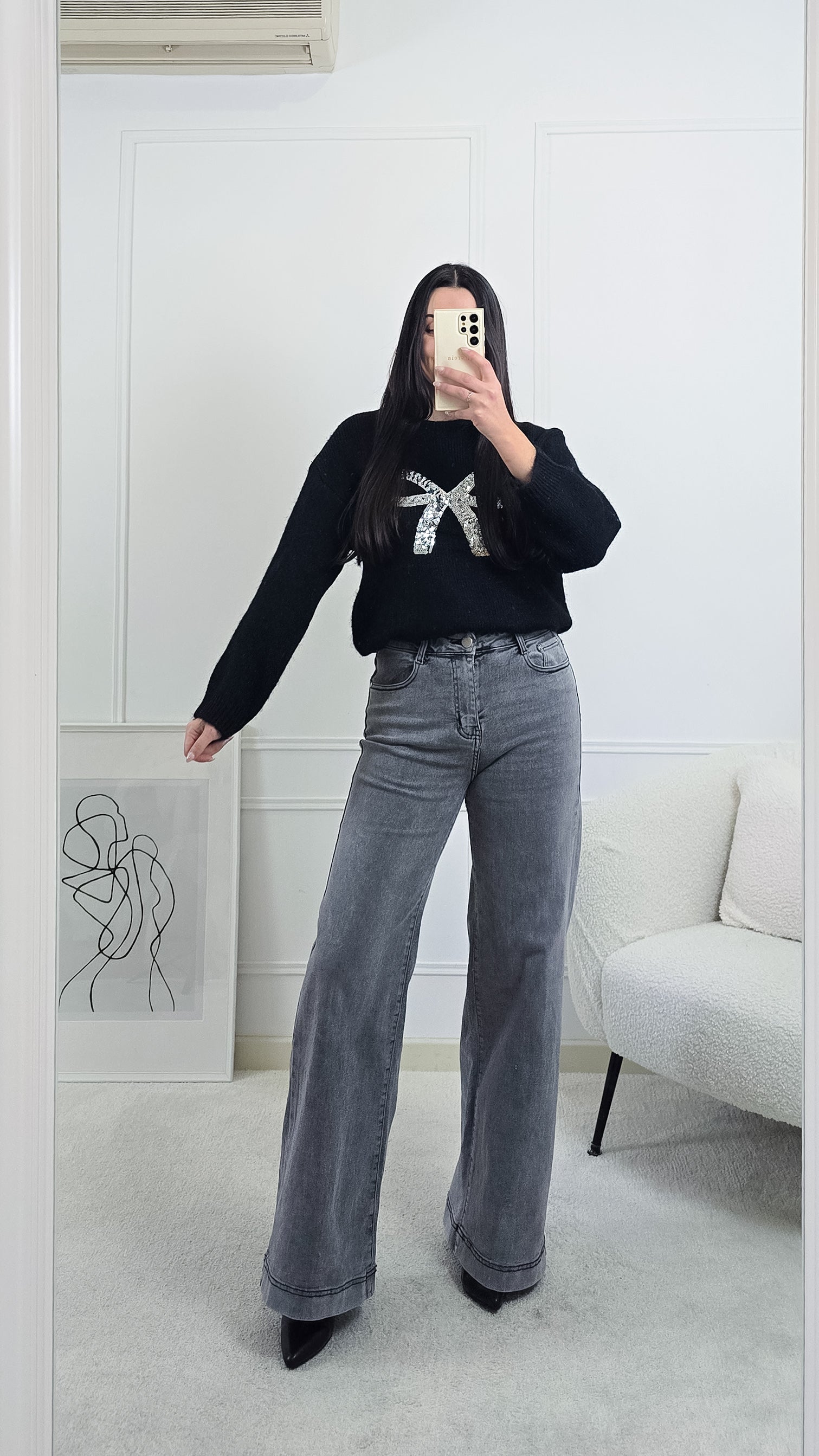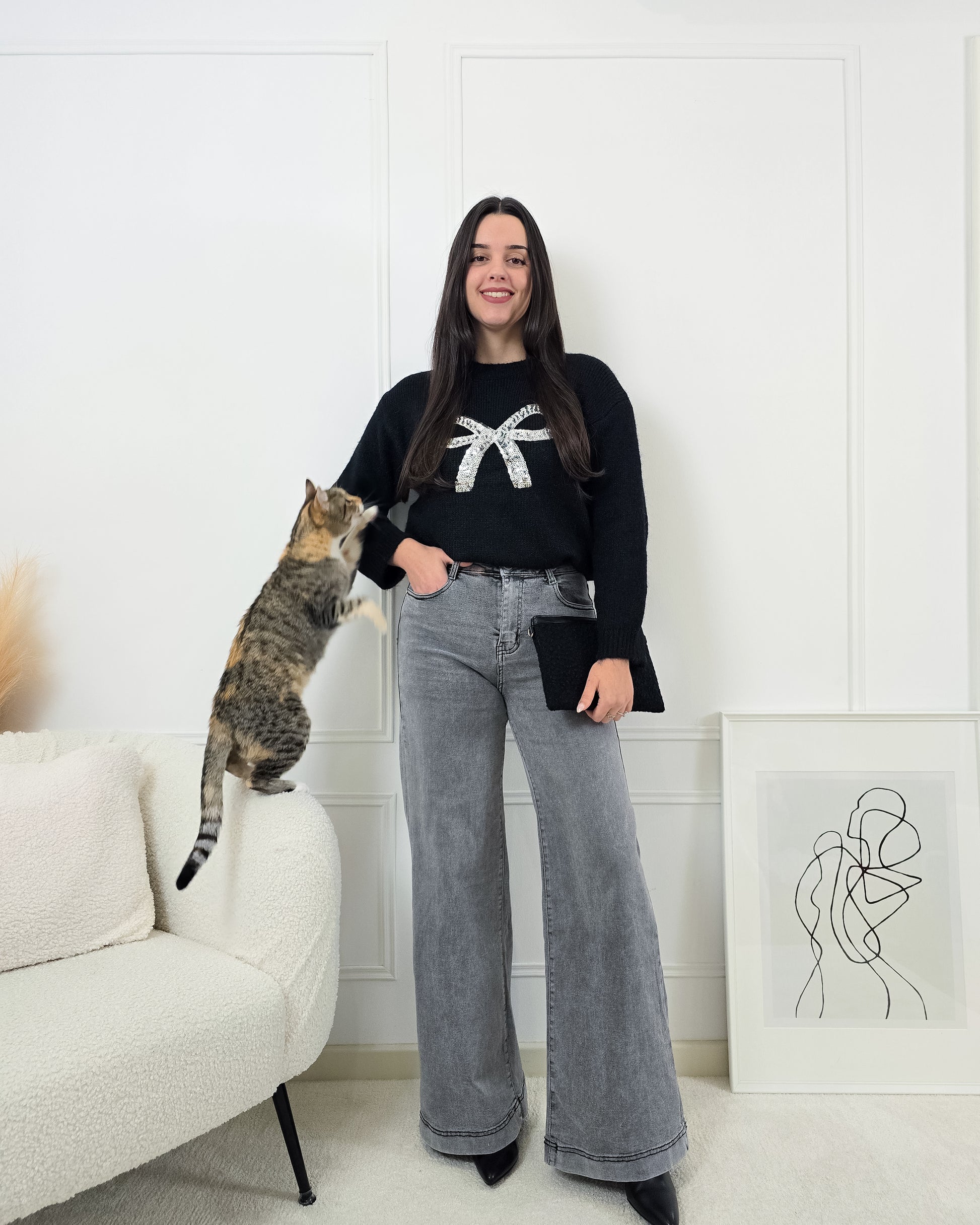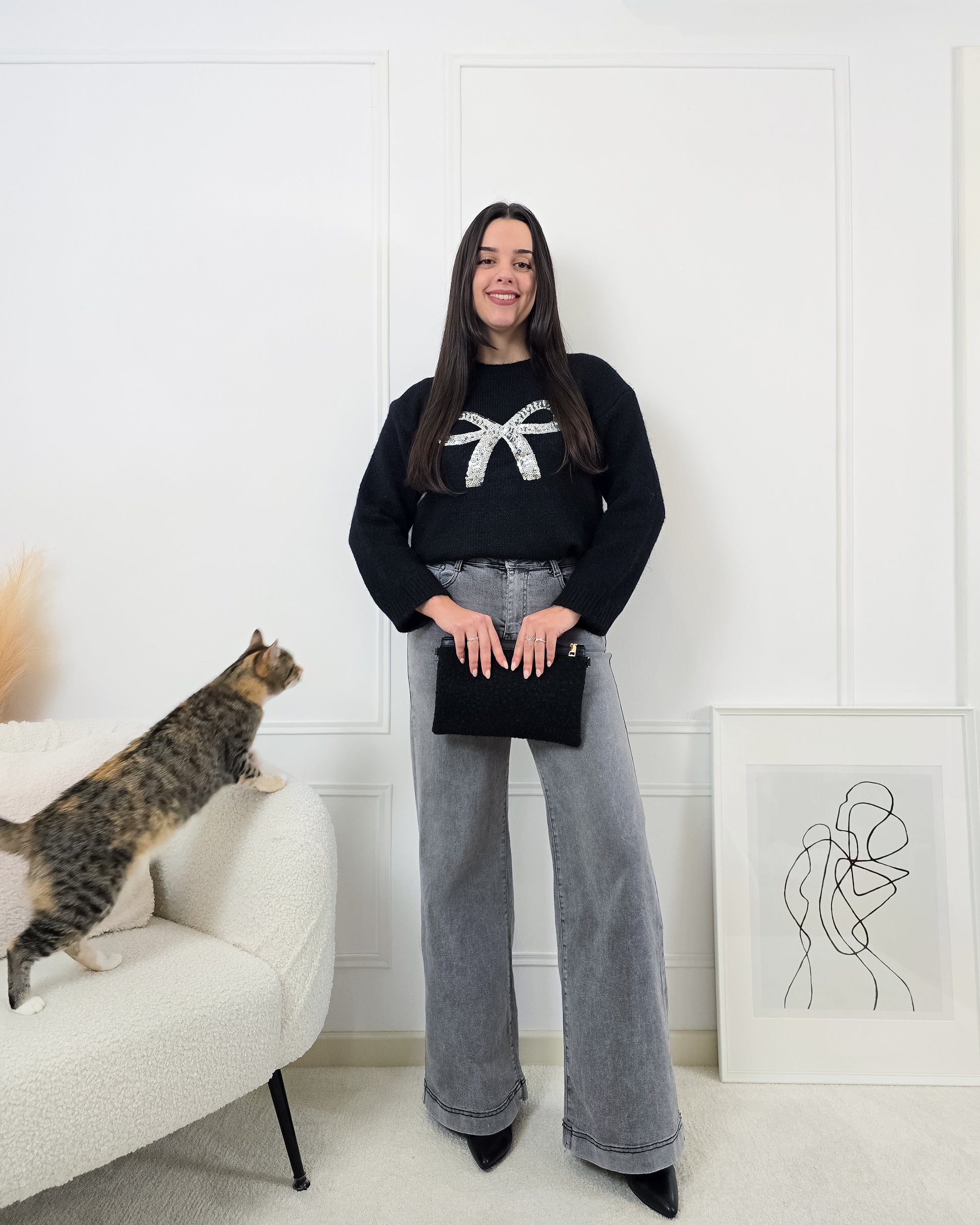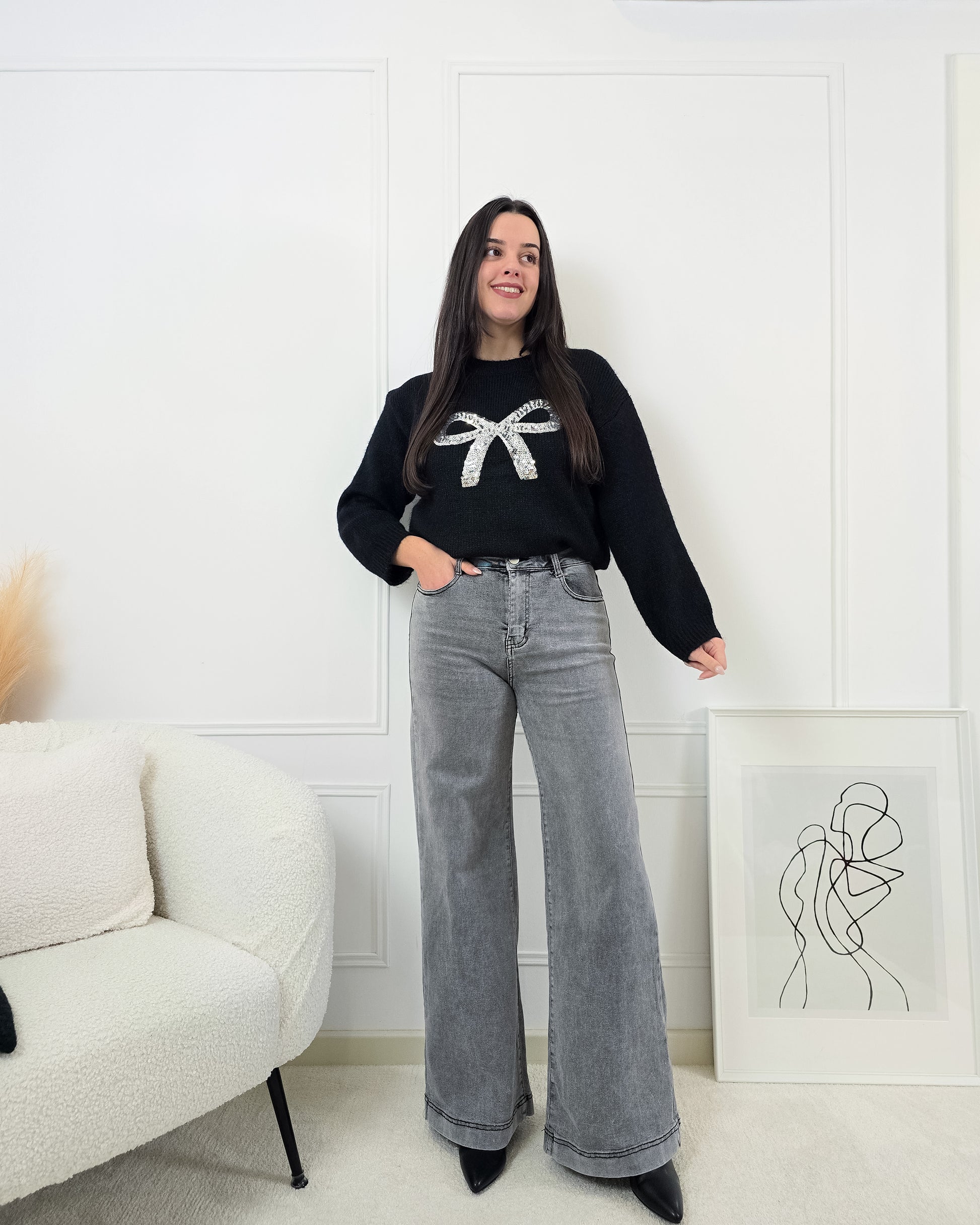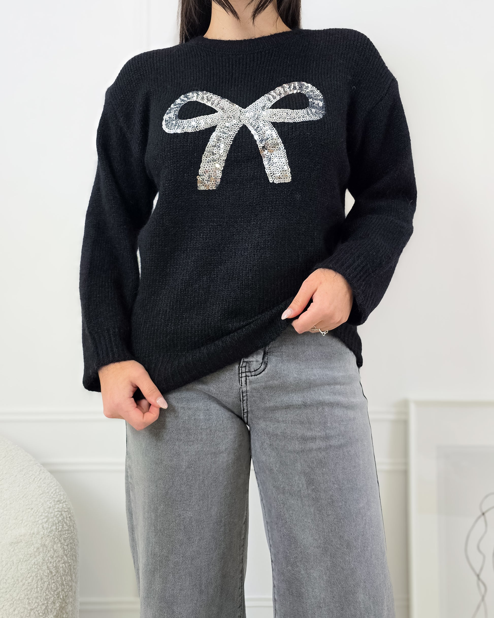Dá brilho aos dias frios com esta camisola de malha, decorada com um laço de lantejoulas que faz toda a diferença!